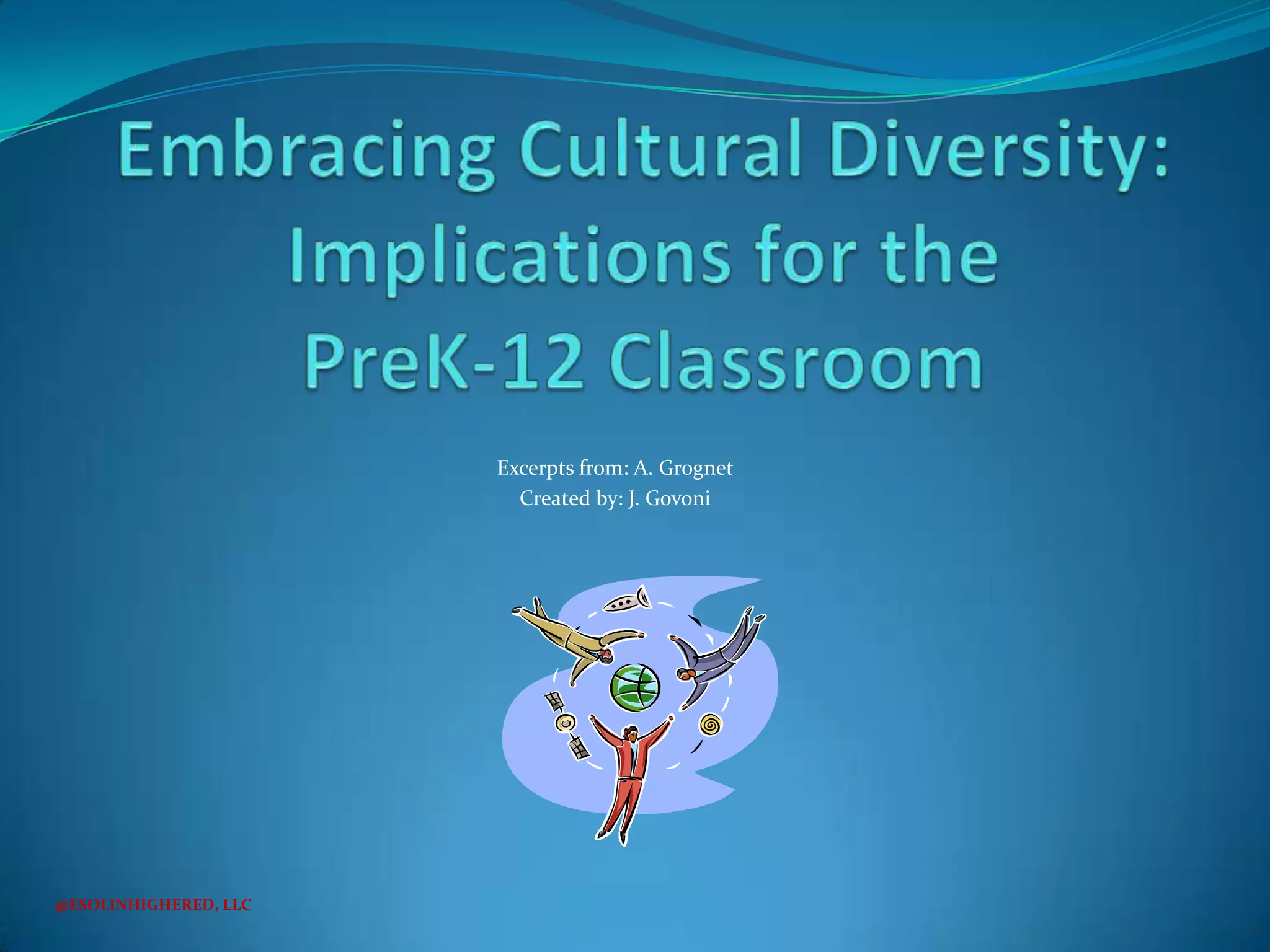 Culture is a universal aspect of human life that is learned, shared, and transmitted through language. It includes patterns of behavior, beliefs, and customs that are acquired as a member of a society. Culture is not static, but changes over time as it is closely related to language. It provides a set of common understandings and ways of perceiving the world that make interactions predictable. Effective teachers understand the relationship between culture and language and promote cultural competence in the classroom.