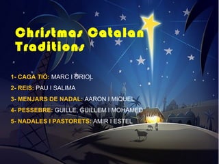 The document summarizes several Christmas traditions in Catalonia, Spain. It describes the caga tió, a log that children hit with sticks while singing songs to receive presents; the tradition of the Three Kings who bring gifts to children on January 6th; typical Christmas meals including torrons, cannellonis, and tortell de reis cake; nativity scenes called pessebres, including small figurines like el caganer; and pastorets plays that act out the story of Jesus' birth along with singing Christmas carols.