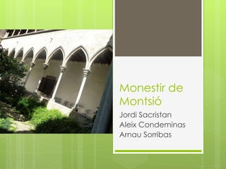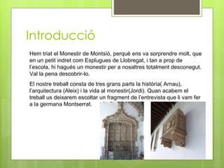 Introducció Hem triatel Monestir de Montsió, perquè ens va sorprendre molt, que en un petit indret com Esplugues de Llobregat, i tan a prop de l’escola, hi hagués un monestir per a nosaltres totalment desconegut. Val la pena descobrir-lo. El nostre treball consta de tres grans parts la història( Arnau), l’arquitectura (Aleix) i la vida al monestir(Jordi). Quan acabem el treball us deixarem escoltar un fragment de l’entrevista que li vam fer a la germana Montserrat.