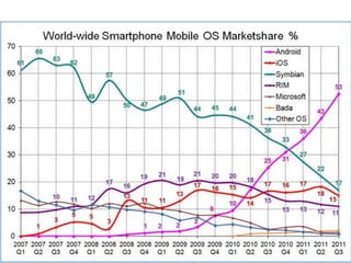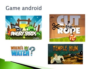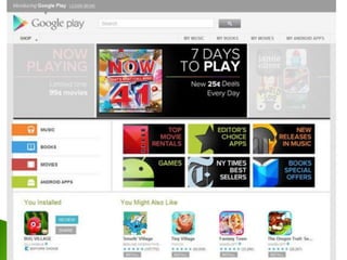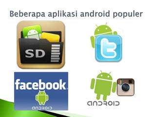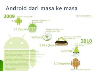 Seminar membahas tentang sistem operasi Android, yang merupakan sistem operasi berbasis Linux untuk perangkat seluler seperti ponsel pintar dan tablet. Android dikembangkan oleh perusahaan Google setelah mengakuisisi perusahaan Android Inc. Sistem operasi ini menggunakan nama makanan penutup sebagai nama versi, seperti Cupcake, Donut, Eclair, dan lainnya.