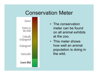 The document discusses endangered animals and conservation efforts. It describes how the conservation meter at zoos shows an animal's status in the wild. Species become endangered due to factors like habitat loss, disease, and human activity. Extinction is the disappearance of an entire species, which can occur naturally or due to human impacts that are destroying habitats and introducing threats. Zoos are working to conserve species through programs like Species Survival Plans, which manage breeding populations across zoos to maintain genetic diversity and prevent extinction.