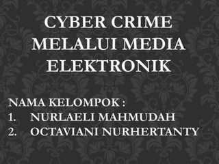 Dokumen tersebut membahas tentang pengertian, sejarah, klasifikasi, jenis, contoh kasus dan analisis cyber crime. Cyber crime adalah bentuk kejahatan yang terjadi di internet atau dunia maya dengan menggunakan komputer atau jaringan sebagai alat, sasaran, atau tempat kejahatan. Contoh kasus cyber crime yang dijelaskan adalah penipuan lowongan kerja secara online dan pencurian pulsa melalui SMS.