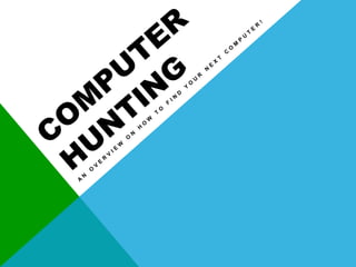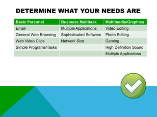 This document provides information to help determine the right type of computer for your needs. It discusses factors to consider like intended use, operating systems, and key components. Popular brands are listed, with HP and Dell commanding over 50% of the market. Desktops provide more power for cost while laptops are portable. Processors, storage, memory, graphics, audio, inputs/outputs are examined. Budget recommendations are provided based on basic, business, gaming or video editing needs, with prices starting at $350 and going up to $1800. Resources for further research are also included.