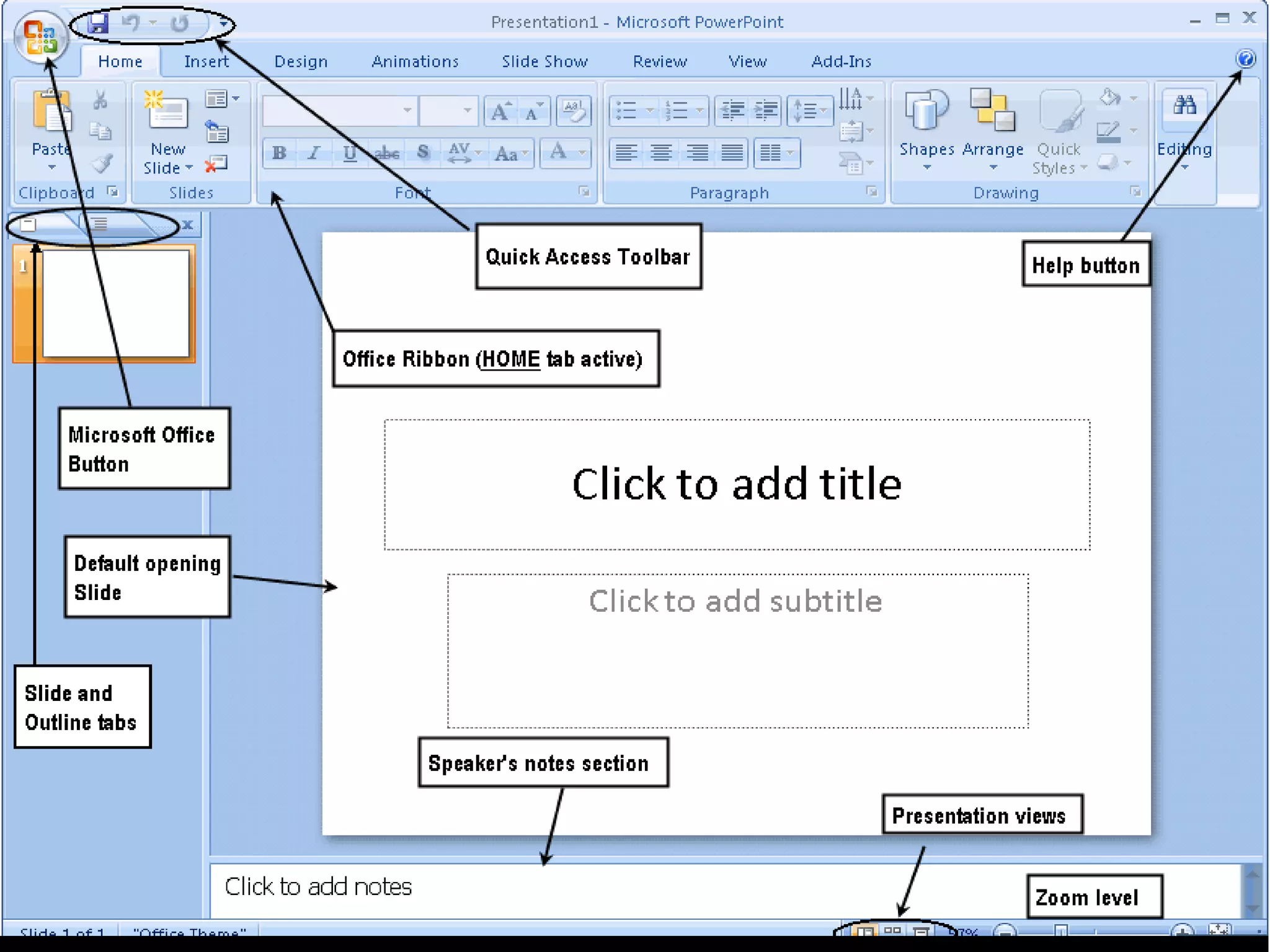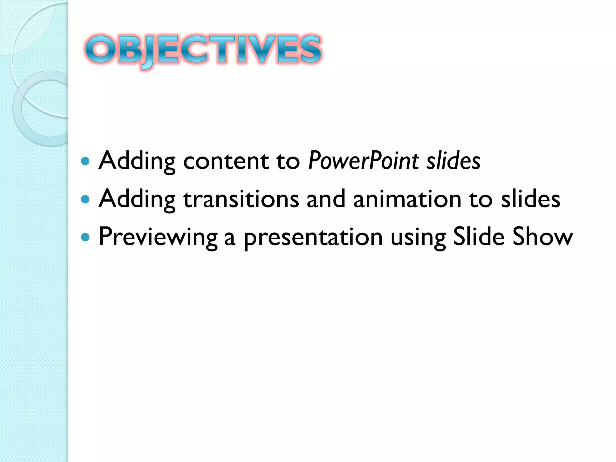 The document discusses various features of Microsoft PowerPoint for creating presentations including adding content and formatting to slides, adding transitions and animations, and previewing a presentation in Slide Show view. It also provides steps for inserting tables, charts, pictures, and SmartArt graphics into slides as well as adding notes, hyperlinks, and action buttons.