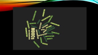 This presentation provides an overview of MOOCs (Massive Open Online Courses). It defines MOOCs as online courses that provide unlimited and open access to students worldwide. The history section outlines that the first MOOC emerged in 2008 through a course on connectivism that had over 2,000 registered students. MOOCs work by having curriculum and video lectures and require students to participate in online discussions, quizzes and activities. They are characterized by being free, unlimited and allowing open access to learning content. The presentation also describes the two main types of MOOCs and outlines the presenter's fields of interest within biology for MOOC study.