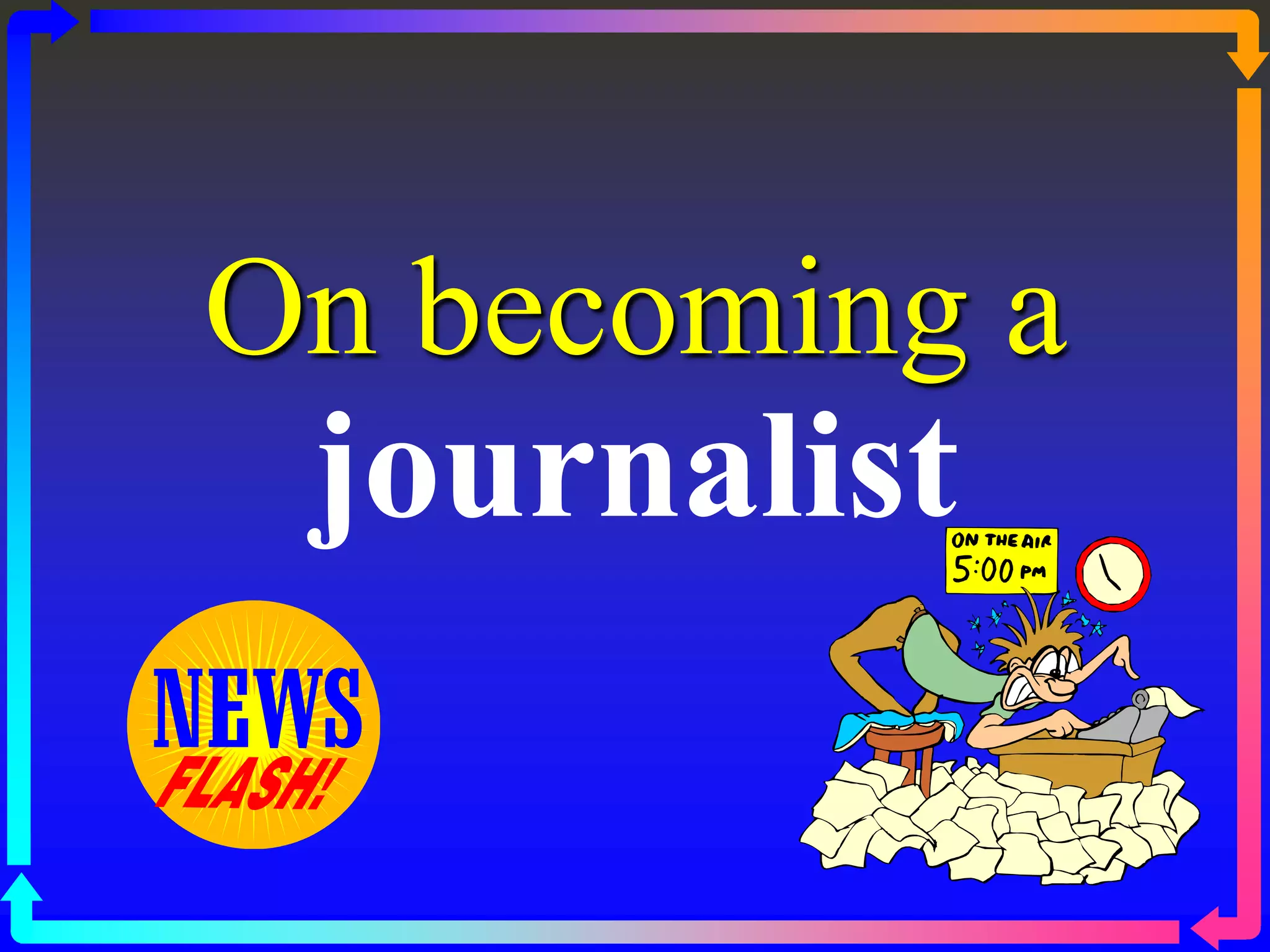 This document provides guidance for becoming a journalist. It covers understanding news values, gathering news from various sources, writing news stories using the inverted pyramid structure, conducting interviews, writing different story types like features and sports, and creating editorial pieces, reviews, and surveys. The key aspects of writing news include focusing on the most important facts, maintaining objectivity and balance, using attribution and quotes, and providing timely and accurate information for readers.
