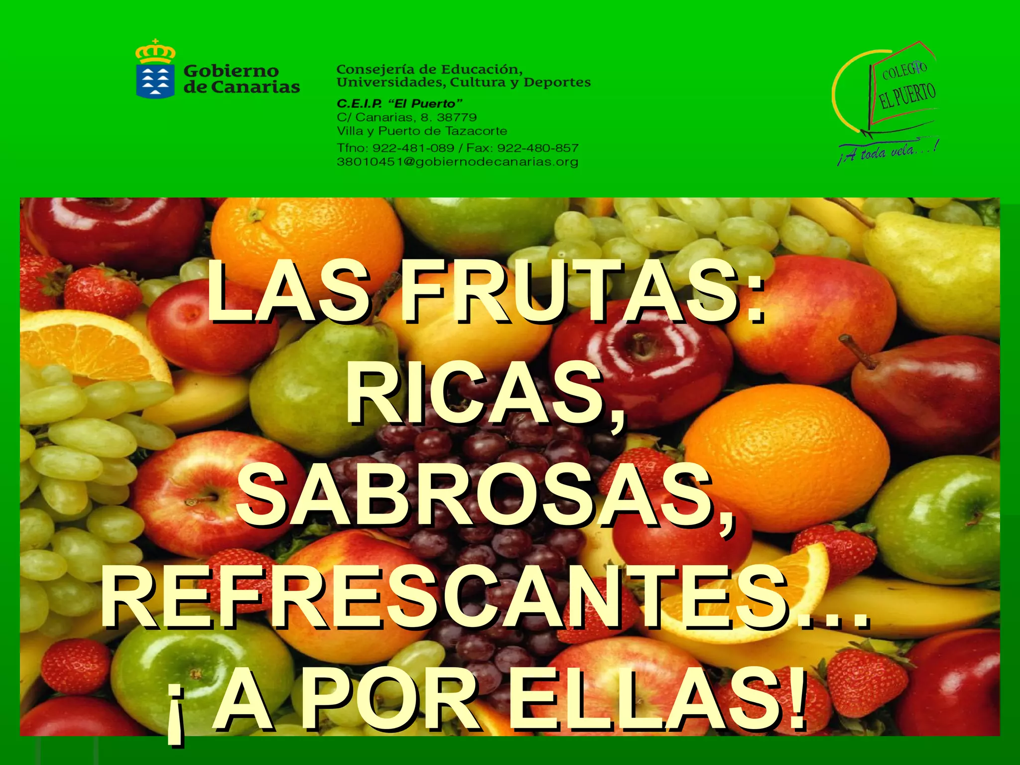 El documento promueve el consumo de frutas en un centro educativo por sus beneficios nutricionales y para la salud. Se detallan las vitaminas, minerales y fibra que aportan las frutas y cómo contribuyen a la hidratación y energía del cuerpo. El centro ha implementado diversas actividades como talleres, concursos y una semana de la salud para enseñar a los estudiantes sobre las frutas y alentar su consumo a través de degustaciones y la creación de zumos y postres.