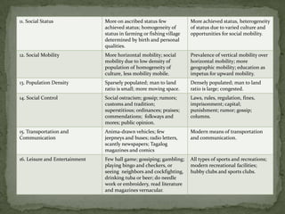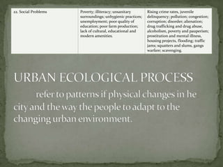 This document discusses rural and urban communities. It defines a community as a social organization territorially based where members satisfy daily needs and deal with common problems. Rural communities are usually small with homogeneous culture and personal relationships, while urban communities are larger with more heterogeneity. The document then compares ecological processes in rural and urban areas, like concentration, dispersion, and segregation, and discusses models of urban spatial characteristics.