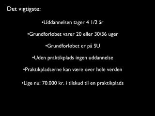 #5 Stikord til informationsmødet d. 23,9.2011 1. I er i gang med en erhvervsuddannelse: det er ikke kunst - det drejer sig om et levebrød. 2. Erhvervsuddannelserne er lavet om: Vi taler om en forskole med kompetencer. Stor styring til os selv. Målstyring 3. Vi uddanner fotografer, FTP’ere og webintegratorer. Det er vi gode til: vælg os. 4. Vi ønsker, at vores elever yder deres bedste. Hvis I ikke er klar til det, vil vi foreslå, at I holder jer væk. der er ikke plads til folk, der gør tingene halvt - heller ikke her! 5. Vi gennemfører det således: Planen vises Hvis I vælger os, så vælger I også vores måde at gøre det på. Det er hårdt at sige, men reglen er denne: hvis ikke i kan tåle at tabe, skal I slet ikke spille. Der vil være en del af jer, der ikke kommer videre. Vi lover at hjælpe jer alt hvad vi kan (det er en del), men det forudsætter, at I yder jeres bedste. Opholdet bliver godt, men der er ingen garanti for en færdig uddannelse. 9. Kompetancer og merit 10. Filmklub, fester, åben skole 11. Vores pædagogik og vores kriterier for udvælgelse 13. SU, skolehjem, den praktiske dagligdag, etc. 14. Kriterier for optagelse 15. Skolehjemmet 16. SU 17. I får svar senest d. 1. december 17. Antal elever med aftaler 18. Studieafklarende forløb Transport: Unge mellem 16 og 19 år, der er tilknyttet en ungdomsuddannelse, skal have et såkaldt hypercard, som vil give de unge mulighed for at køre med al kollektiv trafik i alle døgnets timer for blot 300 kroner om måneden. Det hjælper jo ikke alle jer, der er ældre, men det kan da være en støtte. Udland. Beløb: 1500 kr. Berlin, kopier, materialer, osv.