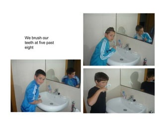 A person wakes up at 8am, brushes their teeth at 8:05am, and has breakfast at 8:15am before going to school at 8:30am, where they have lunch at 2:30pm, do homework at 4pm, and play football at 5:10pm before having dinner at 8pm and going to bed at 9:30pm.