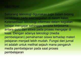 Dokumen ini membahas pengaruh penggunaan teknologi dalam pendidikan untuk meningkatkan aktivitas kelas dan interaksi antara guru dan siswa. Integrasi media pembelajaran, seperti program komputer dan internet, diharapkan dapat memperbaiki metode pengajaran yang tradisional dan memenuhi kebutuhan pendidikan abad 21. Meskipun banyak guru masih menggunakan metode lama, penggunaan teknologi harus disesuaikan dengan tujuan pengajaran agar efektif dan sesuai dengan kurikulum.