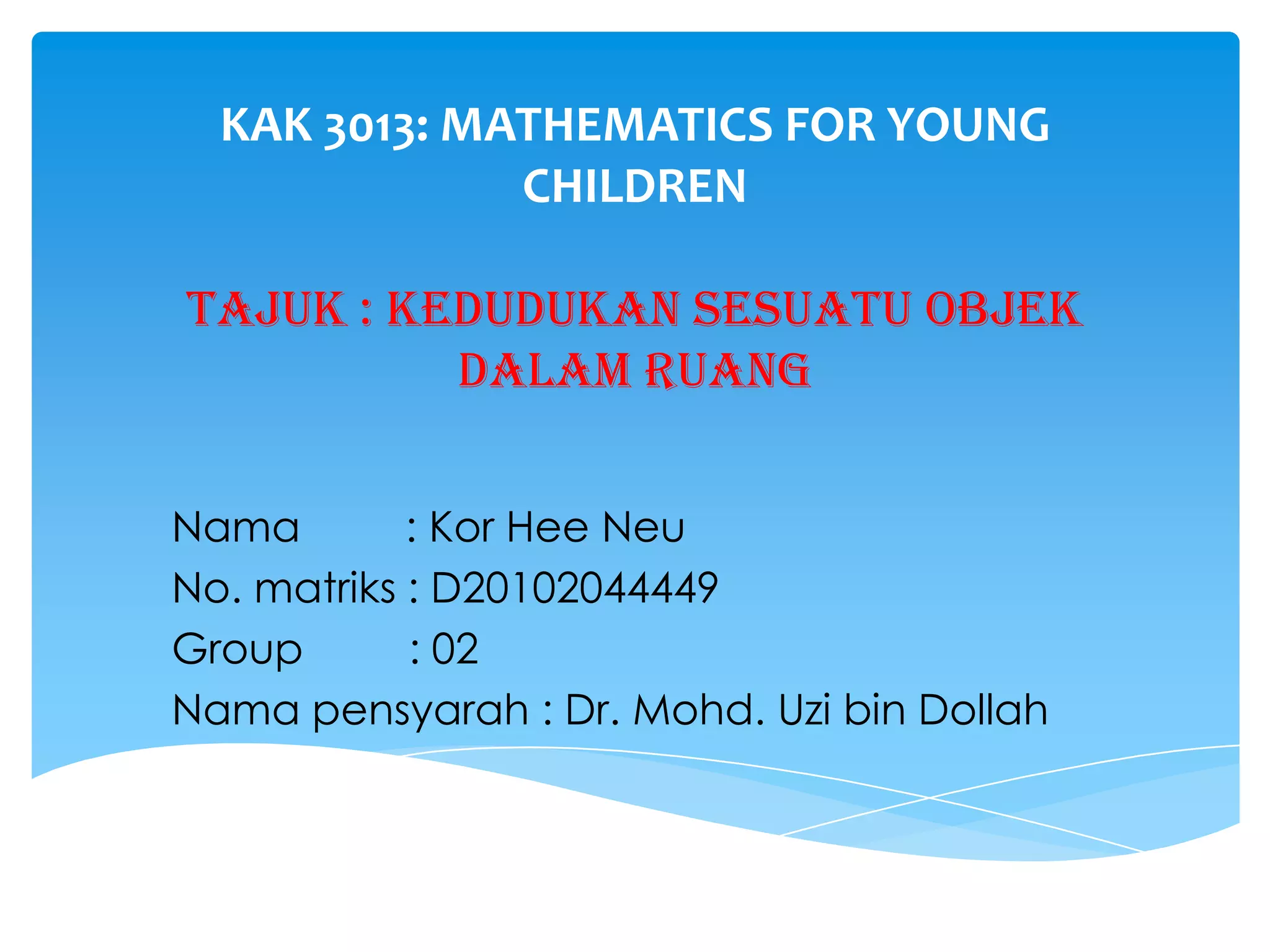 Dokumen ini berkaitan dengan pengajaran kedudukan objek dalam ruang kepada kanak-kanak menggunakan lagu sebagai alat bantu. Ia menyenaraikan beberapa lokasi seperti atas, bawah, depan, dan belakang serta menggalakkan pelaburan visual dengan pemadanan gambar. Aktiviti yang dicadangkan melibatkan pemilihan gambar berdasarkan arahan guru.