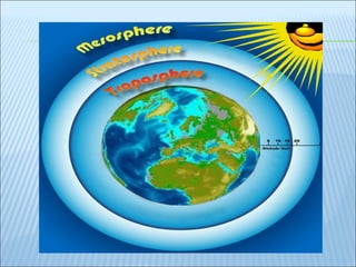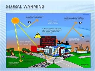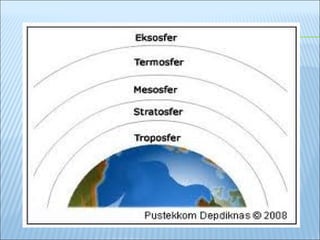 Dokumen ini membahas karakteristik lapisan atmosfer bumi, termasuk troposfer, stratosfer, mesosfer, termosfer, dan eksosfer serta peran pentingnya dalam melindungi bumi dari sinar ultraviolet dan menjaga suhu. Selain itu, dijelaskan mengenai efek rumah kaca yang disebabkan oleh peningkatan gas rumah kaca akibat aktivitas manusia dan dampaknya terhadap pemanasan global serta perubahan iklim. Untuk mengatasi masalah ini, disarankan pengurangan penggunaan kendaraan, penggunaan energi ramah lingkungan, dan pelestarian hutan.