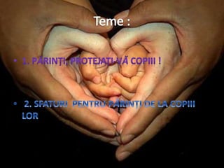 Documentul prezintă un program al Uniunii Femeilor Bihor Oradea intitulat 'Șanse Egale', având ca obiectiv educația și protecția copiilor împotriva violenței prin educația religioasă și morală, promovarea bunelor maniere și a respectului față de mediu. Se oferă sfaturi pentru părinți privind comportamentul corect față de copii și responsabilitatea educațională, subliniind importanța comunicării și a stabilității în relația părinte-copil. De asemenea, sunt incluse și sfaturi din perspectiva copiilor către părinți, evidențiind nevoia de consistență și încredere în educație.