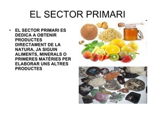 EL SECTOR PRIMARIEL SECTOR PRIMARI ES DEDICA A OBTENIR PRODUCTES DIRECTAMENT DE LA NATURA, JA SIGUIN ALIMENTS, MINERALS O PRIMERES MATÈRIES PER ELABORAR UNS ALTRES PRODUCTES