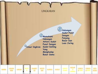 Dokumen ini membahas konsep dasar lingkaran, termasuk definisi, unsur-unsur seperti busur, diameter, tali busur, dan apotema, serta rumus untuk keliling dan luas lingkaran. Selain itu, dokumen menjelaskan hubungan antara sudut pusat dengan panjang busur dan luas juring, serta memberikan contoh soal untuk penerapan rumus tersebut. Penjelasan juga menyentuh sejarah penggunaan nilai π dalam perhitungan lingkaran.
