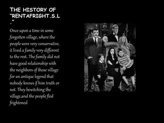 This document appears to be a catalog for a company called "Rent a Fright S.L." that rents out monsters and creatures to frighten people. The catalog describes some of the monsters available, including Edward Cullen, Frankenstein, a family monster pack, kids monsters, Cruella Devil, and Halloween special offers that include additional time or a spell book. It also advertises party packs that include three monsters for events. Contact information is provided at the end.