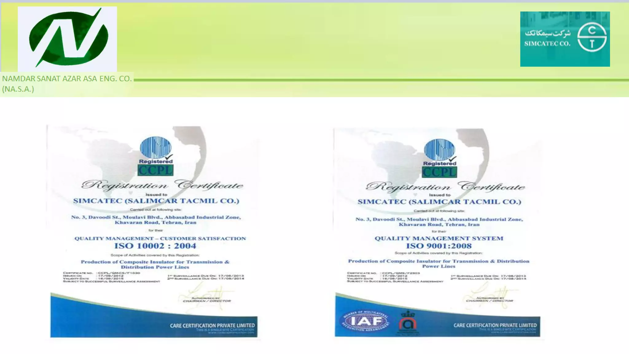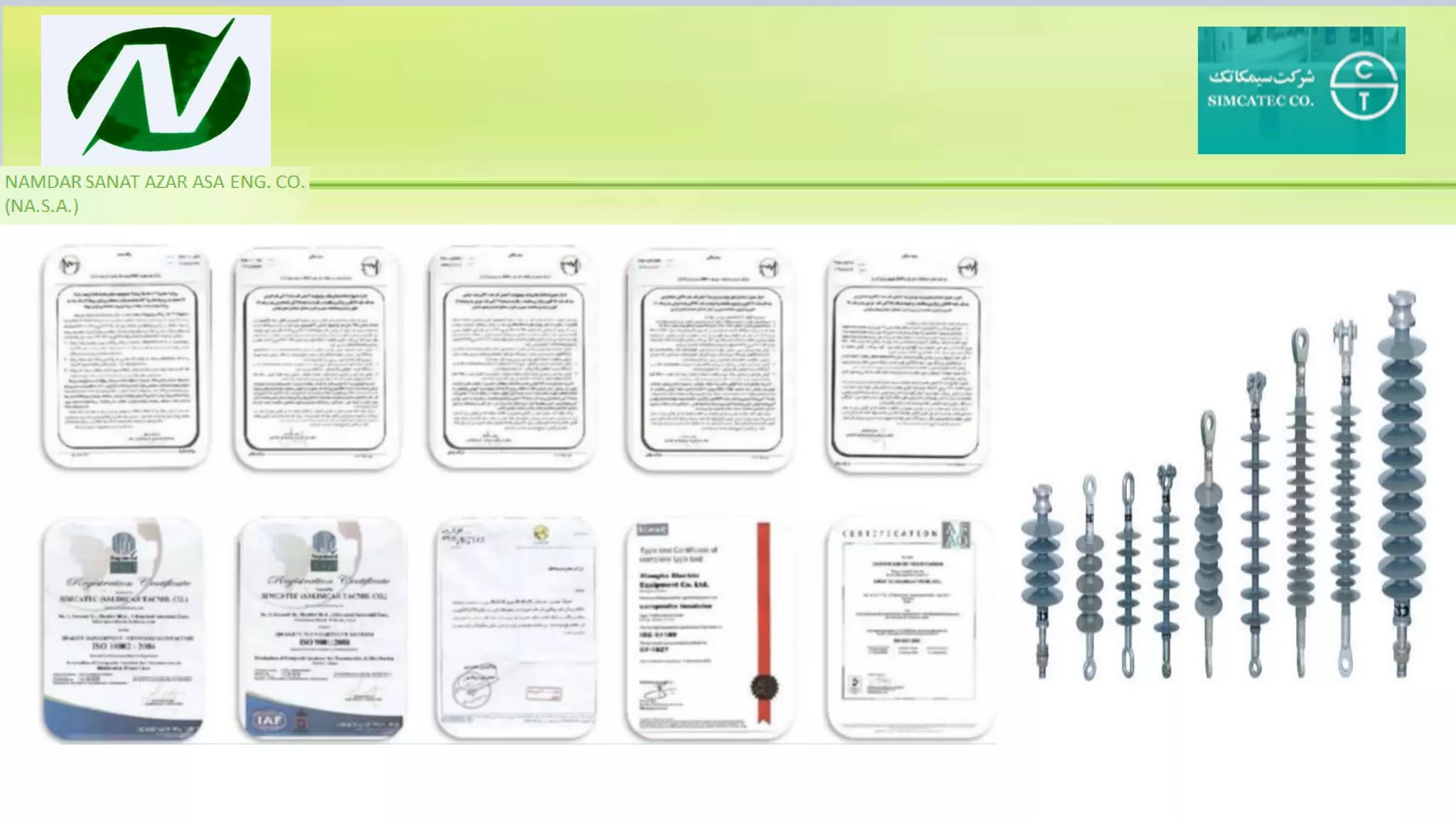 Namdar Sanat Azar Asa (NA. S.A) is an Iranian company that provides power engineering services and high voltage equipment like multi-chamber arresters for protection of distribution and transmission lines against lightning. The company was founded in 1998 by managers and experts from government institutes and private sector to meet needs of Iranian electrical market. It offers products and services for electrical networks up to 400kV, including novel multi-chamber arresters, composite insulators, room temperature vulcanizing silicone rubber coating for insulator maintenance, and transmission line engineering services to improve reliability.