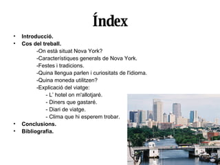 Índex Introducció. Cosdel treball. -On està situat Nova York? -Característiques generals de Nova York. -Festes i tradicions. -Quina llengua parlen i curiositats de l'idioma. -Quina moneda utilitzen? -Explicació del viatge: - L’ hotel on m'allotjaré. - Diners que gastaré. - Diari de viatge. - Clima que hi esperem trobar. Conclusions. Bibliografia.