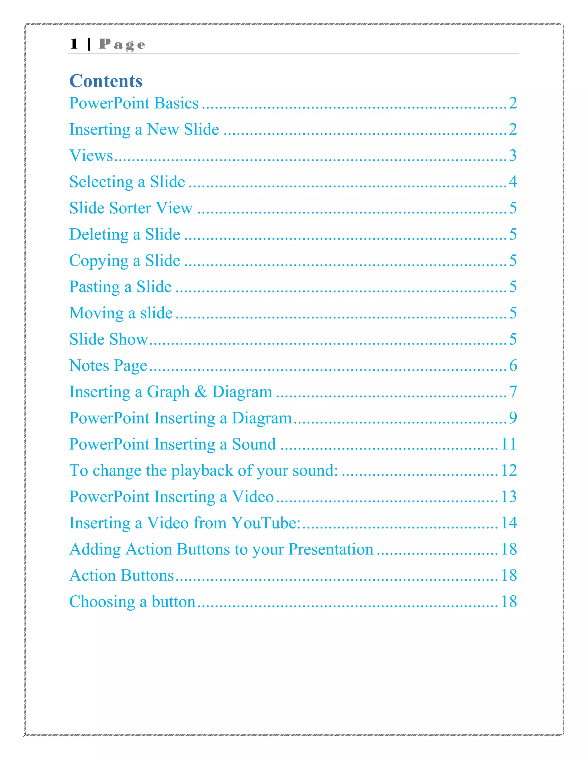 - Inserting new slides, views, graphs, diagrams, sounds, videos and action buttons.
