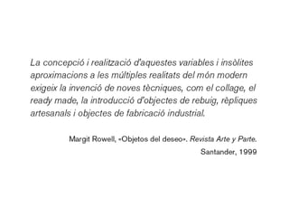 M. Broodthaers. Grancassola de musclos. 1966 M. Broodthaers. 289 couquilles d’oeufs. 1966 MARCEL BROODTHAERS 1924 · 1976. El discurs de Broodthaers es centra en la crítica que es pot fer a l’estatut que adquireix l’art I sobretot el museu. Es mostra irònic amb la cultura oficial I fa us d’objectes paradoxa (semblen de veritat). És hereu de Dalí I sobretot de Magritte.