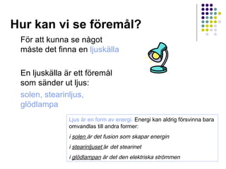 #8 Ljusstrålar som har skickats ut från en ljuskälla går rakt fram tills det att de träffar ett föremål- Då kan de antingen reflekteras mot del, eller gå igenom föremålet. När du ser något betyder det att ljuset har reflekterats och sedan nått ditt öga.