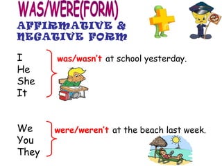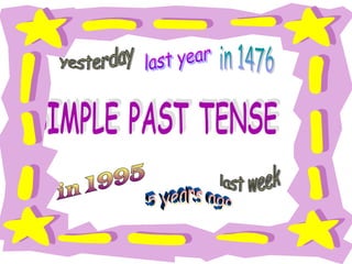 This document provides examples of using simple past tense in English. It discusses affirmative, negative, and question forms of simple past tense verbs for singular and plural subjects. Examples are given for regular and irregular verbs. The purpose of simple past tense and how to transform sentences from present to past tense are explained. Finally, there are exercises with blanks to practice simple past tense verbs.