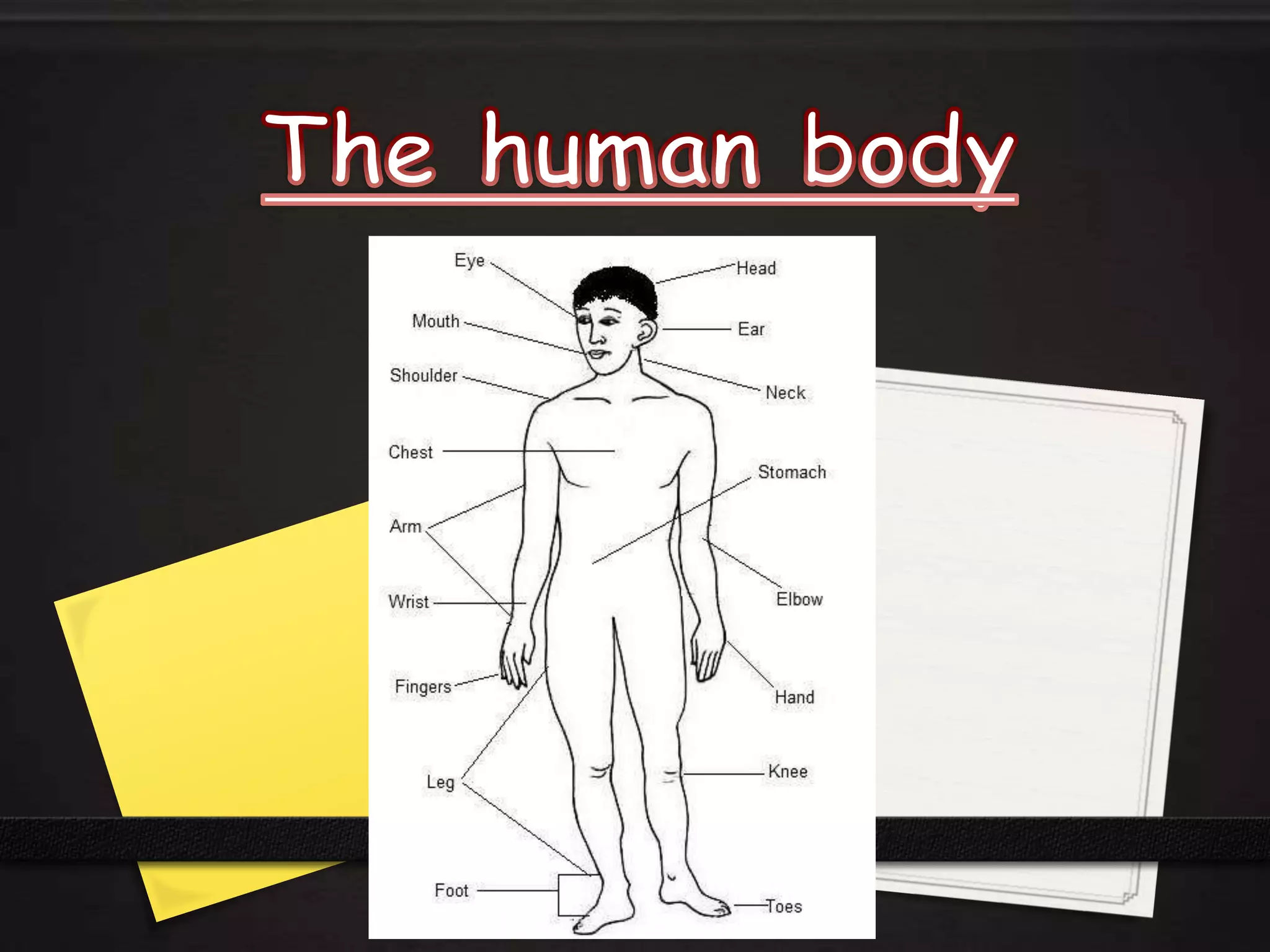 This diagram shows the major parts of the human body labeled in a simple visual format. Key areas like the head, eyes, nose, mouth, ears, shoulders, neck, chest, stomach, arms, hands, fingers, hips, legs, thighs, knees, and feet are represented. The body is shown from the front with labels indicating the location of these body parts.