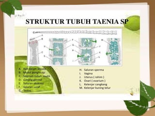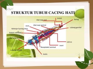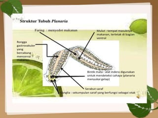 Dokumen tersebut membahas tentang Platyhelminthes (Cacing Pipih) yang merupakan filum hewan triploblastik yang paling sederhana. Platyhelminthes dibagi menjadi 3 kelas, yaitu Turbellaria, Trematoda, dan Cestoda. Platyhelminthes umumnya bersifat parasit pada manusia dan hewan.