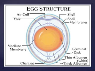 This document discusses tools and equipment for cooking eggs, the nutritional value and components of eggs, and characteristics of quality fresh eggs. It lists various utensils for serving, boiling, scrambling, frying, separating, and cracking eggs. Eggs provide high-quality protein and many vitamins and minerals. As eggs age, the air cell gets larger, the yolk flattens and breaks more easily, and the thick white becomes thin and watery. Eggs are graded A, B, or C based on qualities like yolk shape, air cell size, and shell condition.