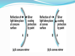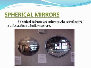 This document discusses spherical mirrors and their properties. There are two main types of spherical mirrors: convex mirrors, whose reflective surface curves outward, and concave mirrors, whose reflective surface curves inward. Concave mirrors form real images where the object and image are on the same side of the mirror, while convex mirrors form virtual images where the object and image are on opposite sides of the mirror.