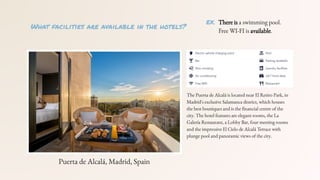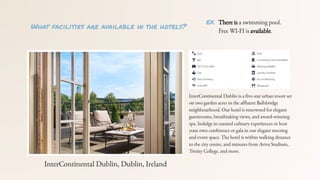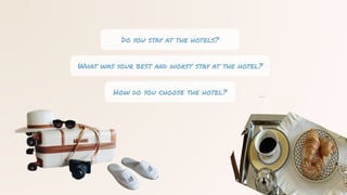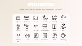 The document discusses various aspects of hotel selection, including room types, services, and facilities offered by hotels. It also includes guidance on interactions at the reception and a dialogue example related to choosing a hotel.