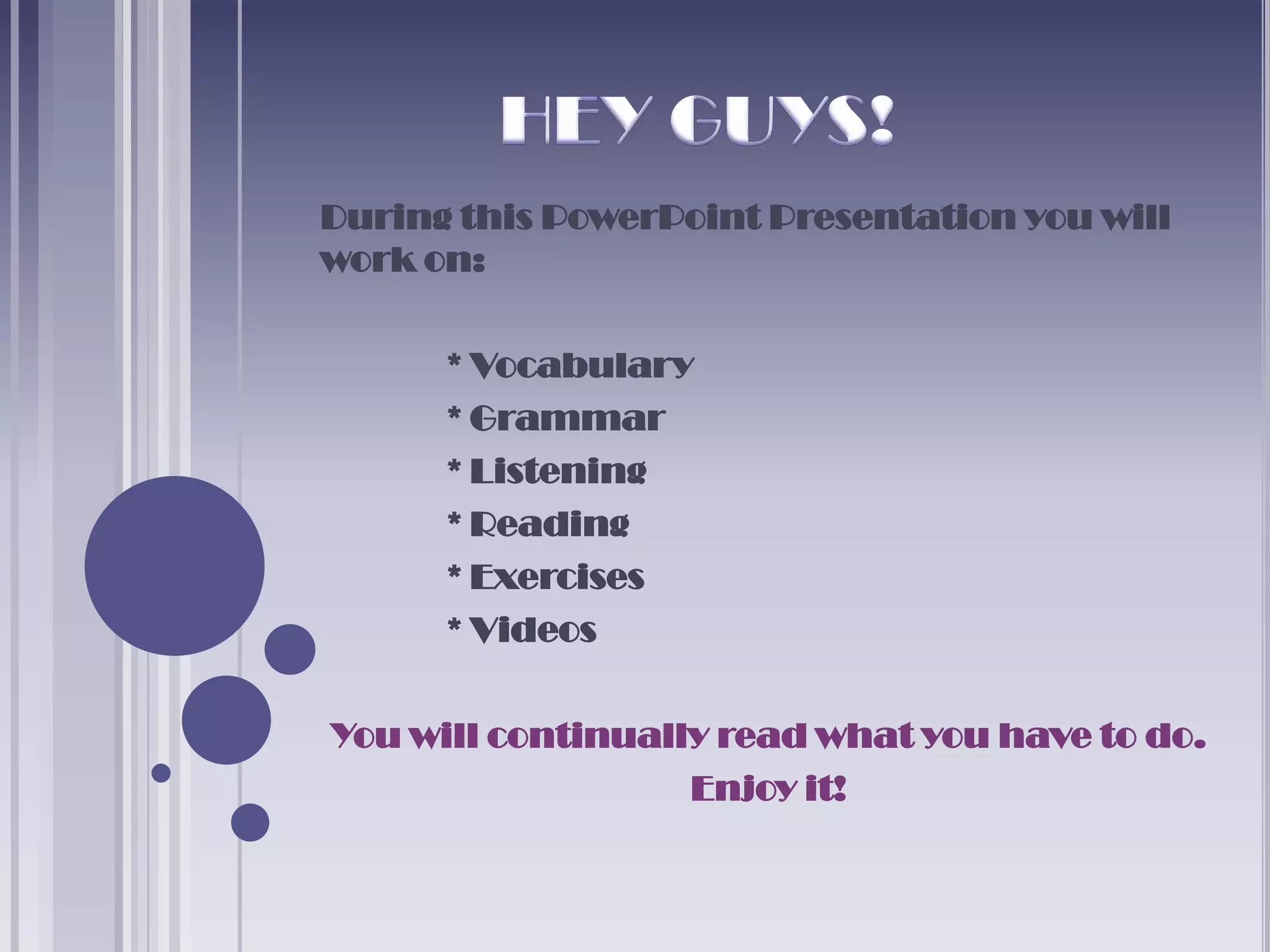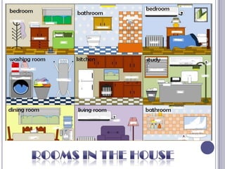This PowerPoint presentation covers various English skills including vocabulary, grammar, listening, reading, and exercises related to rooms in a house. It includes activities where students will read descriptions of rooms and objects in a house, listen to pronunciations, answer questions about a passage on Bill Gates' house, and complete dictation exercises using "this, that, these, those". The presentation is designed to be interactive, with links to additional online resources and instructions for students to email their responses.