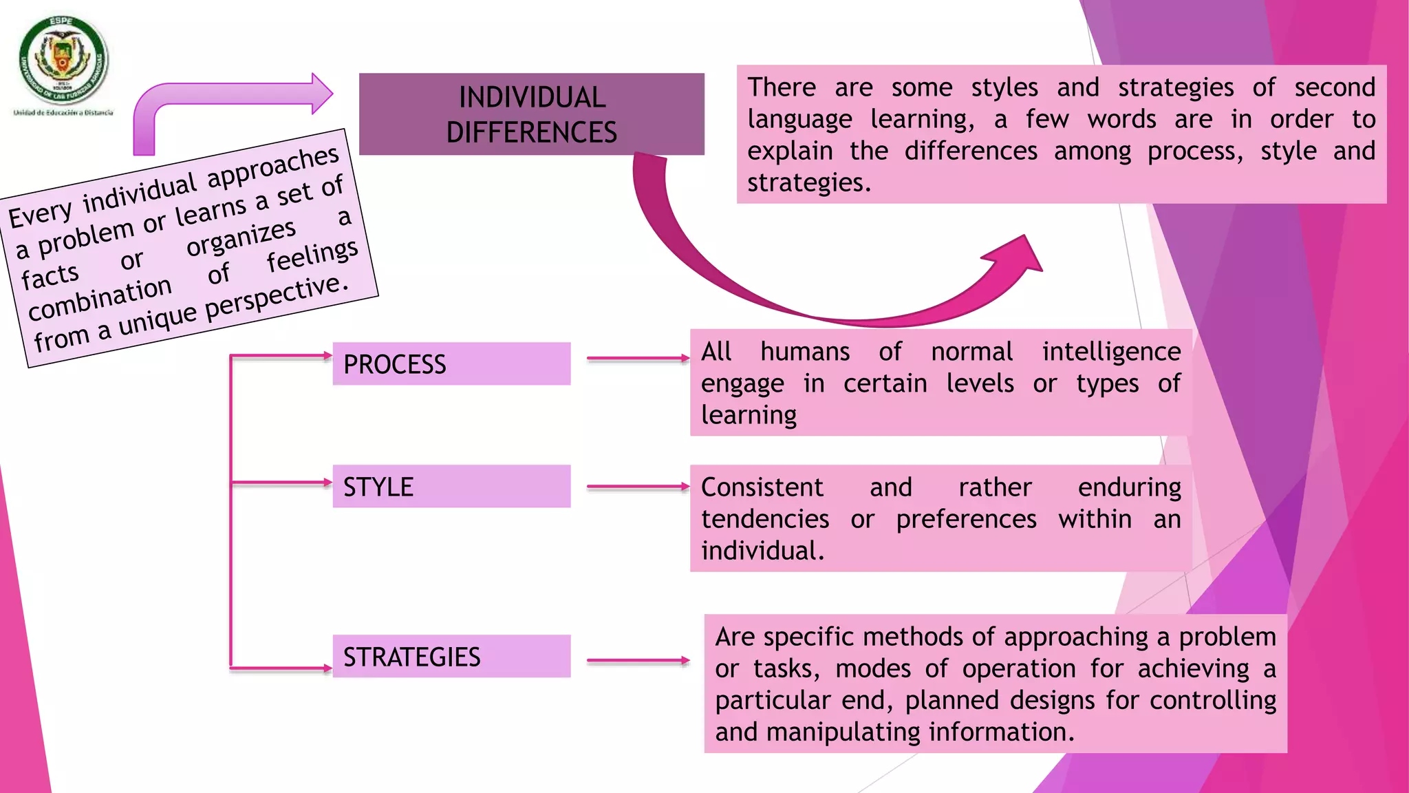 The document discusses individual differences in language learning, including learning styles, strategies, and intelligence. It describes various learning styles like field independence, left and right brain functioning, ambiguity tolerance, and visual vs auditory styles. Strategies discussed include cognitive strategies, socioaffective strategies, communication strategies, and strategies based instruction. The conclusion emphasizes that understanding individual learner differences in styles and traits can help predict language learning success, and teachers should develop instructional strategies that match students' preferred learning preferences.