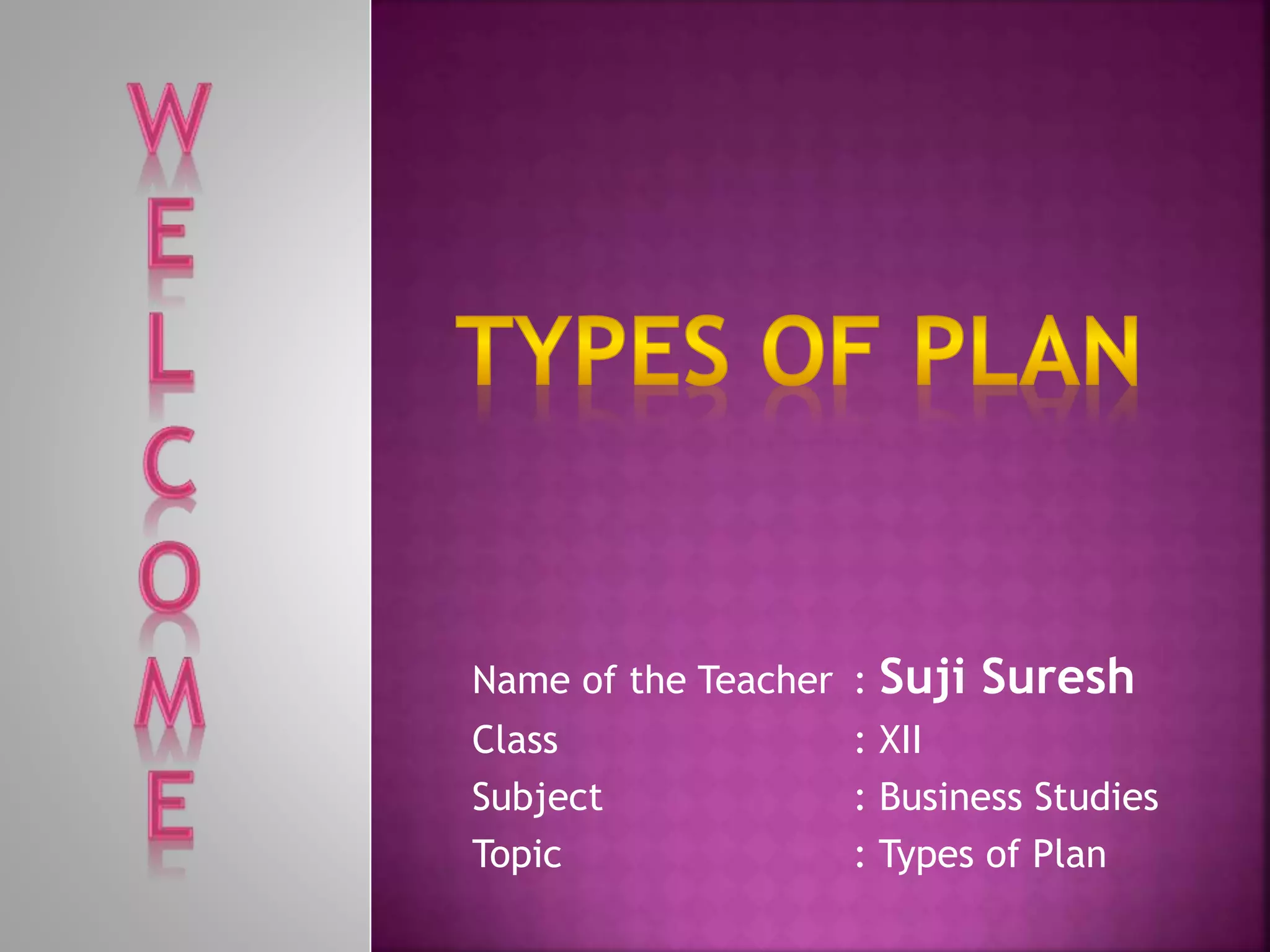 The document discusses different types of plans used in business studies, including objectives, goals, policies, procedures, programs, methods, strategies, projects, and budgets. Objectives are the aims an organization wants to achieve over time. Goals are future states the organization wants to realize. Policies state how an organization will act in certain circumstances. Procedures provide a systematic way to handle regular events, while programs are sequences of activities to achieve objectives. Methods are standardized ways to complete routine jobs, and strategies involve anticipating competitors' reactions. Projects have distinct objectives and completion time periods, and budgets state expected numerical results.