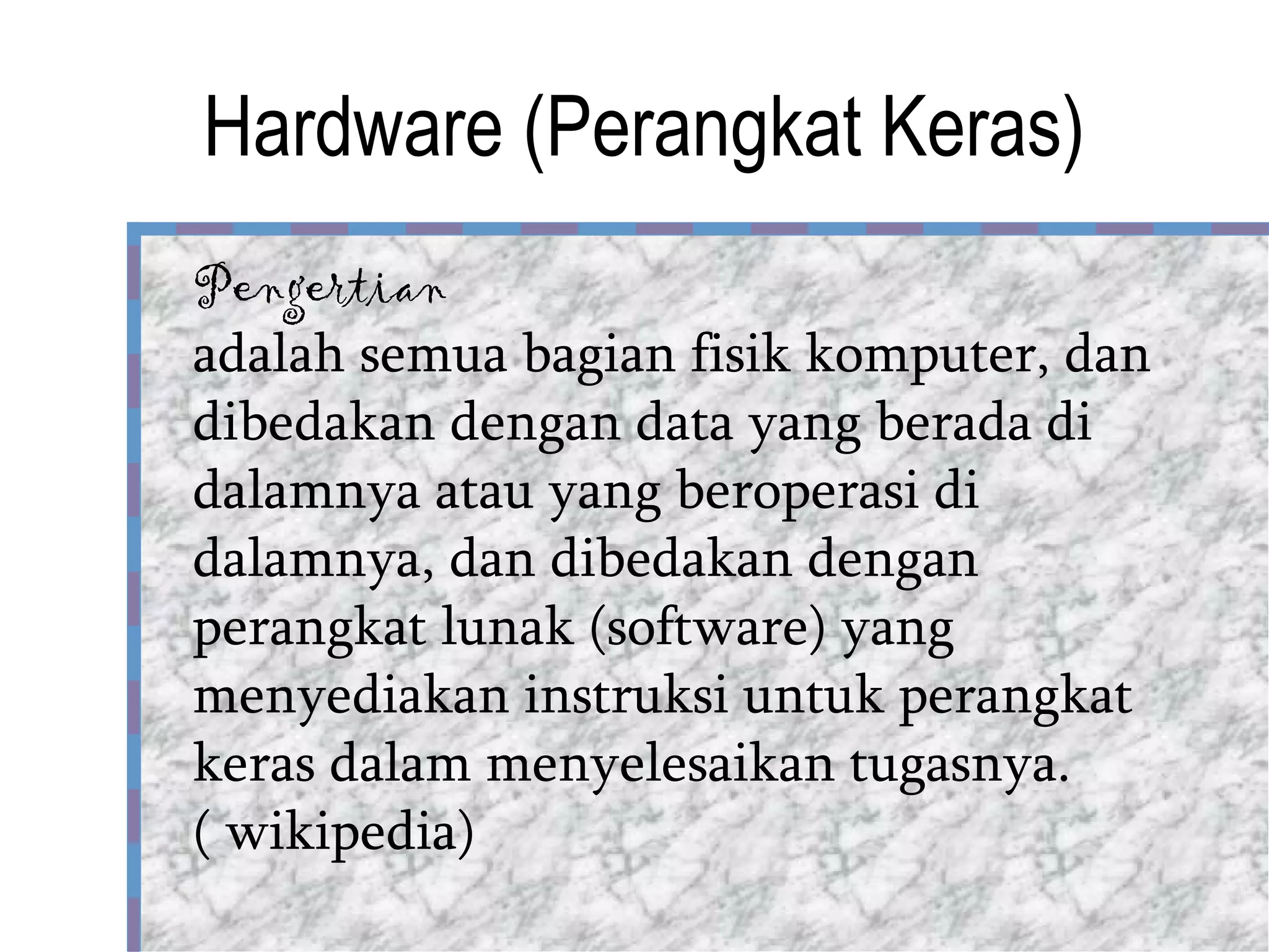 Dokumen ini menjelaskan tentang perangkat keras komputer, termasuk pengertian dan komponen-komponennya seperti monitor, motherboard, processor, dan RAM. Selain itu, juga dibahas hub, repeater, bridge, dan router dalam konteks jaringan. Hukum Moore dan komponen dalam processor, seperti control unit dan arithmetic & logic unit (ALU), juga dijelaskan.
