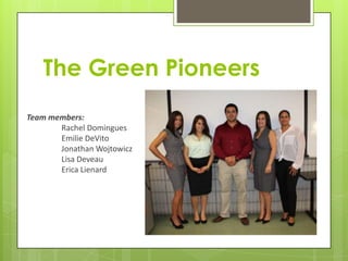 The Green Pioneers team has been working on several recycling education and awareness projects at Gomes Elementary School. They distributed recycling materials and held an assembly for 4th graders. They faced communication issues with their school liaison but have upcoming tasks like creating t-shirts, collaborating with 3rd Eye Unlimited for a final event, and preparing activities and presentations about recycling. Their final event on November 14th will recognize the winner of a t-shirt design contest and educate students about reducing waste.