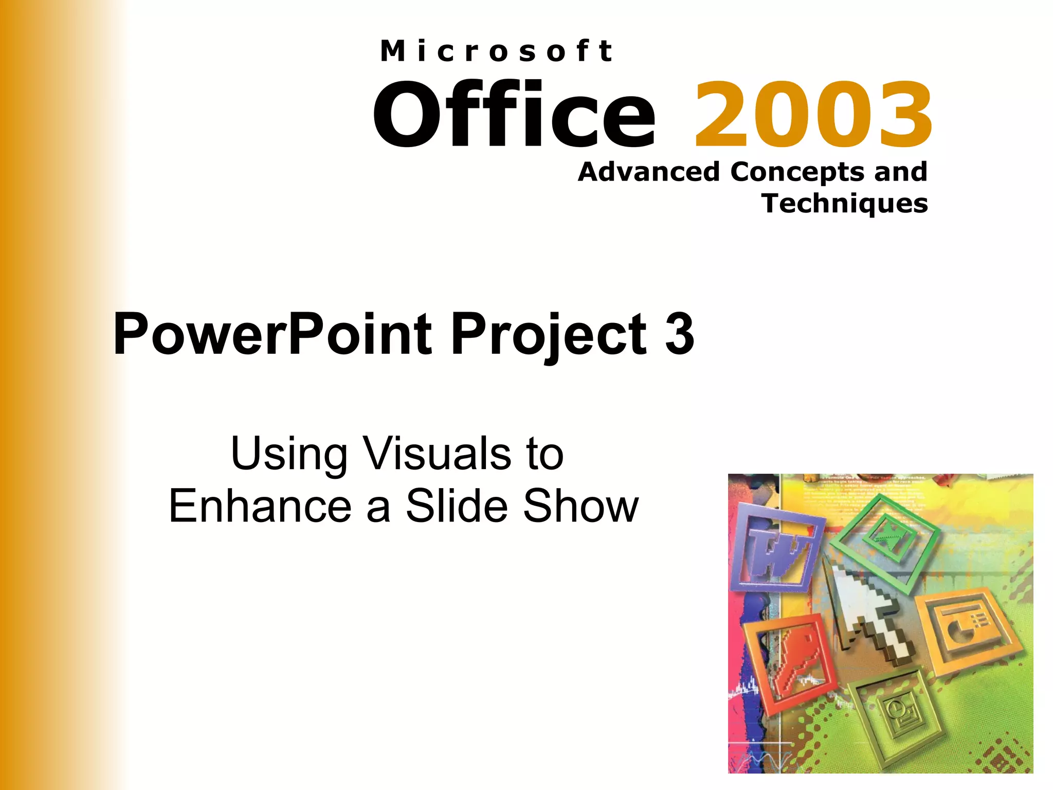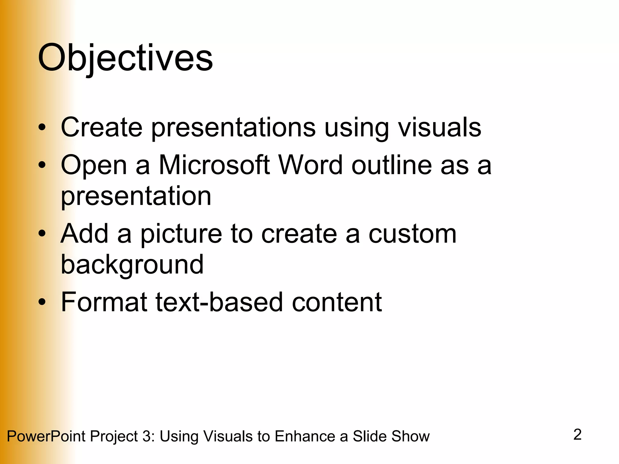 This document provides instructions for using various visual elements to enhance a PowerPoint slide show, including: opening a Word outline as a presentation, adding a background picture, formatting text, inserting and modifying clips, customizing bullets on the slide master, inserting and formatting tables, creating and formatting an organizational chart, applying a design template to a single slide, rearranging slides, adding an animation scheme, and printing slides as handouts.