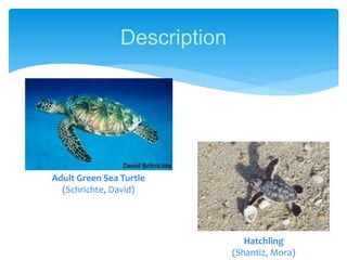 This document provides information about the green sea turtle through pictures and captions. It describes the turtle's appearance, habitat/range in the Pacific and Indian Oceans, diet of jellyfish and algae, and migratory movements guided by the earth's magnetic field. The document also summarizes the turtle's reproductive behavior, solitary nature, natural predators like birds, conservation efforts to protect nesting sites, and complex life cycle from hatchling to adult.