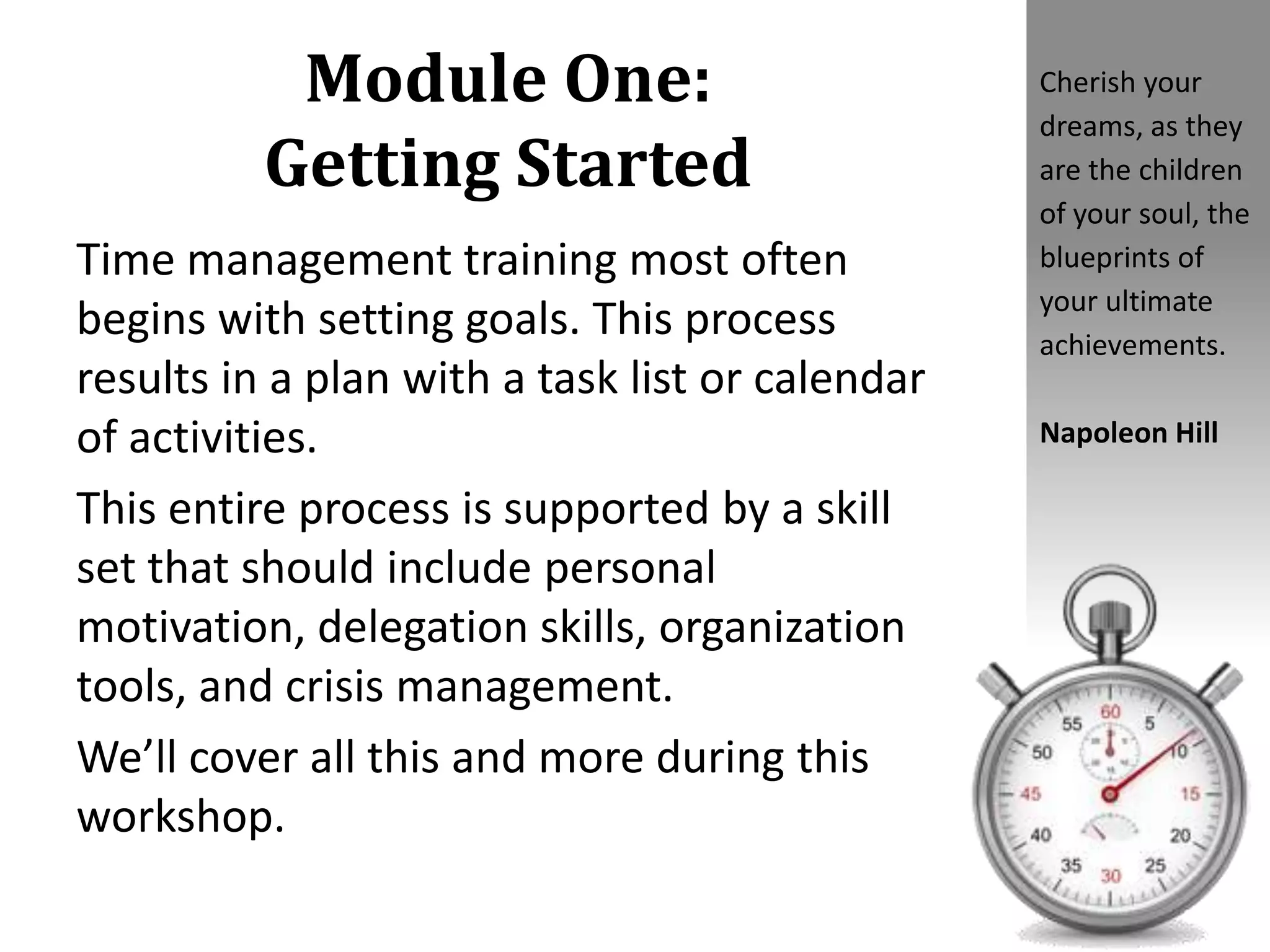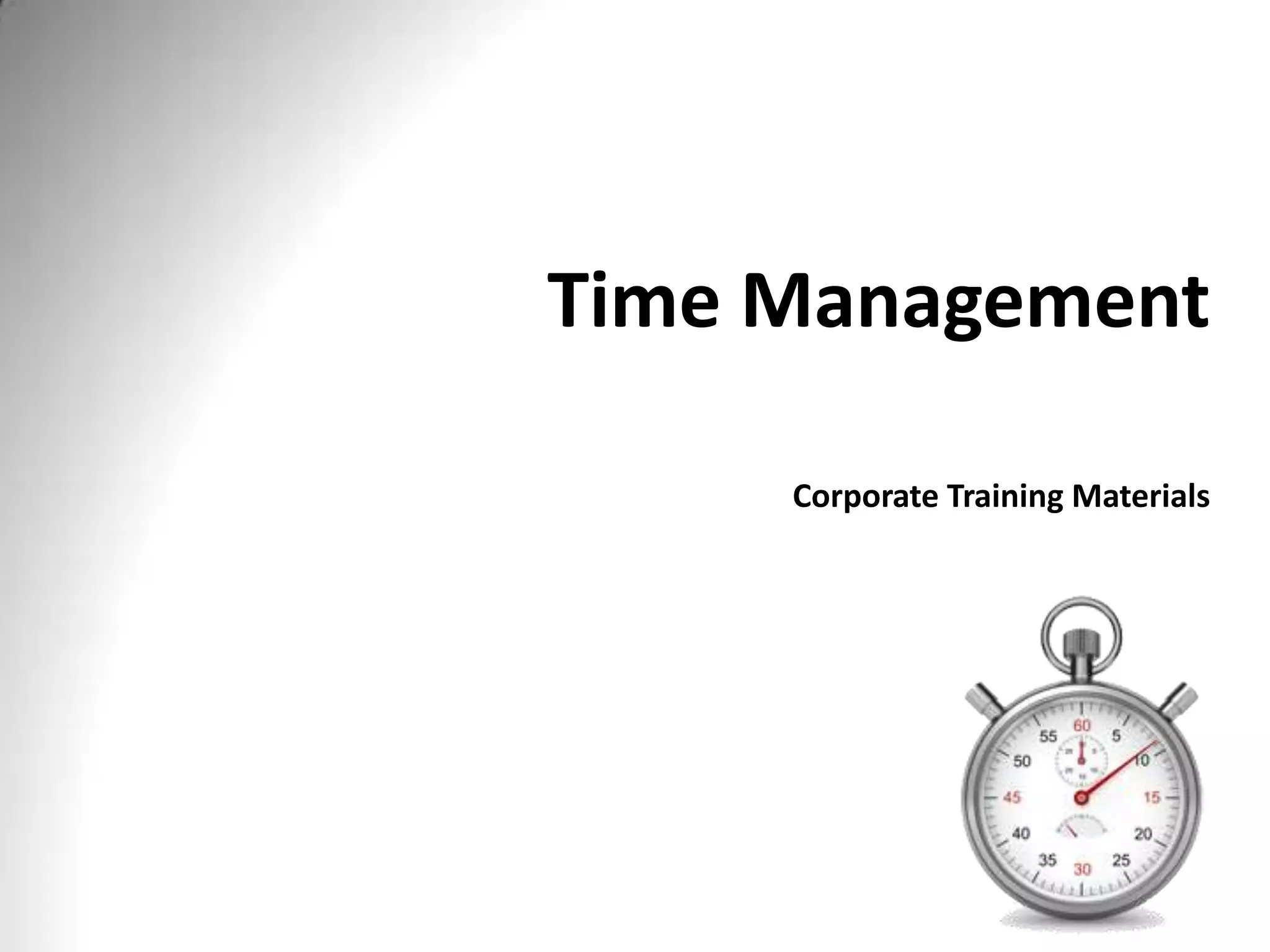 This document provides an overview of a time management training workshop consisting of 12 modules. The modules cover topics like setting goals, prioritizing tasks, planning, organizing one's workspace, delegating work, overcoming procrastination, managing meetings and alternatives to meetings. Each module includes objectives, key concepts, tips, and exercises. The overall aim is to help participants improve their personal time management skills through goal setting, planning, prioritization, organization and learning to say no when necessary.