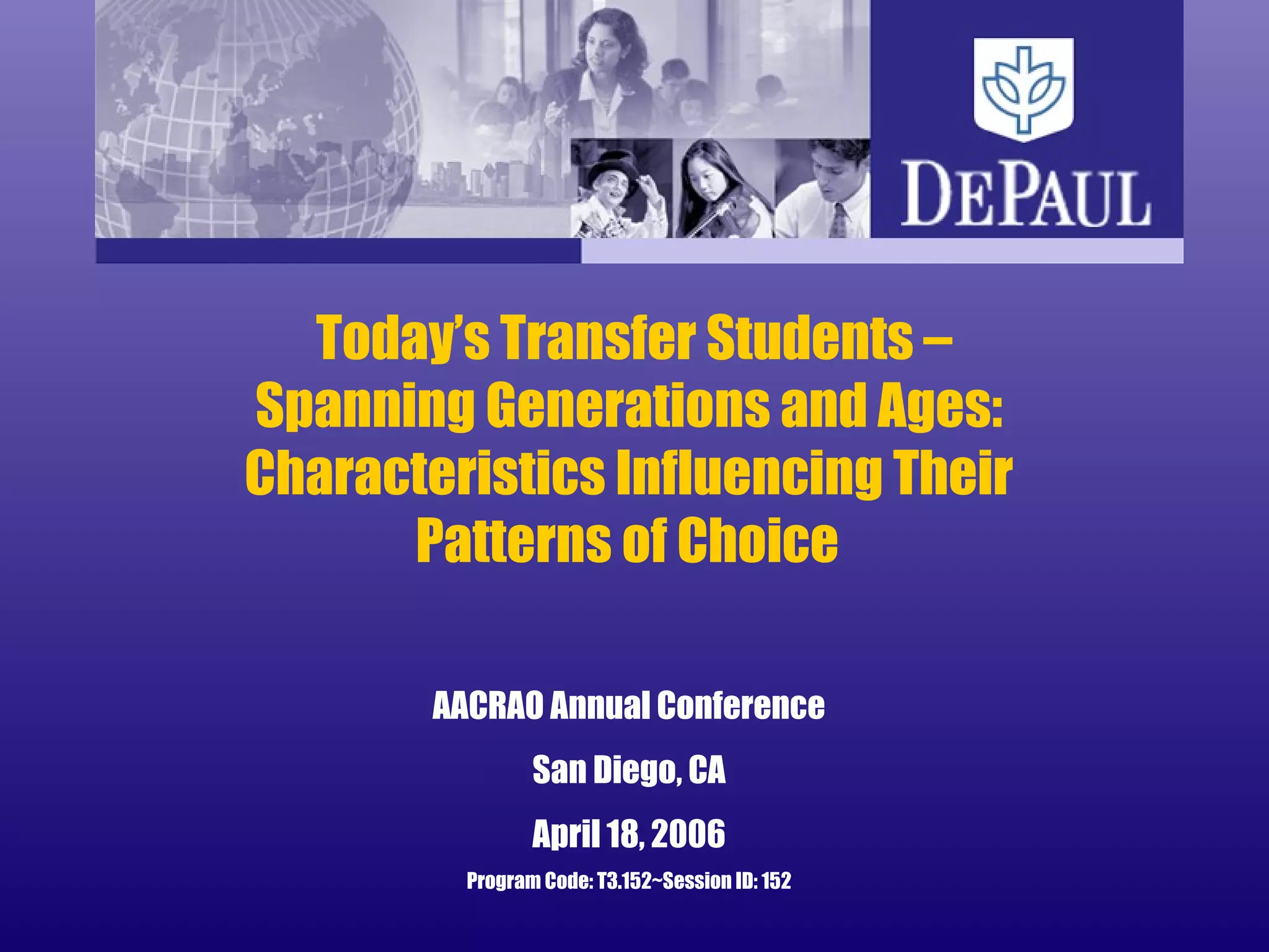 This document discusses transfer students across different generations and the characteristics that influence their choices. It covers the Baby Boomer, Generation X, and Millennial generations, outlining their core traits and how their needs as transfer students differ. Challenges for enrollment managers with each generation are presented, as well as strategies like improved communication, partnerships between 2-year and 4-year schools, and programs tailored to specific generational preferences that can enhance the transfer process. The presentation emphasizes that a one-size-fits-all approach does not work for transfer students and their diverse generational backgrounds must be considered.