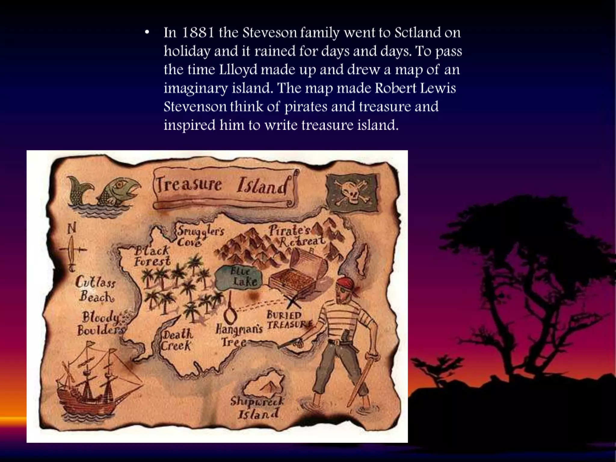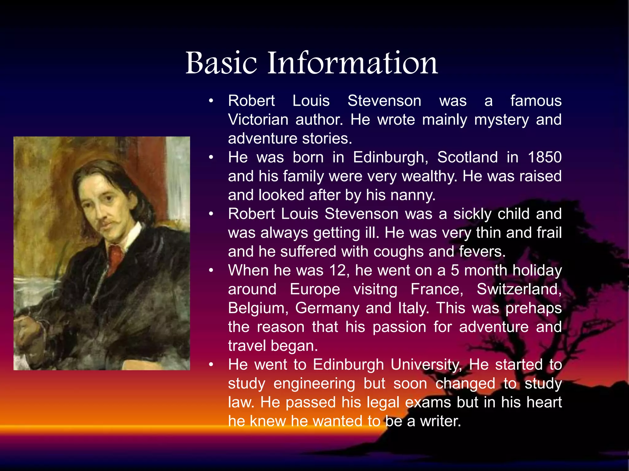 This document provides biographical information about the Scottish author Robert Louis Stevenson. It notes that he was born in 1850 in Edinburgh to a wealthy family, was sickly as a child, and studied law but had a passion for writing. As an adult, he traveled extensively due to his poor health. He met his wife Fanny in France and moved with her to America. His most famous work, Treasure Island, was published in 1883 and brought him great success. He spent time in the Pacific islands for his health and eventually settled in Samoa, where he continued writing until his death in 1894 at age 44.