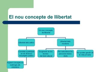 Llibertat positiva illibertat negativa Isaiah Berlin proposa una distinció: - La positiva: consisteix en que l’individu tingui ell mateix el control sobre la seva pròpia vida i decisions. - La negativa: Consisteix a no tenir interferències ni impediments per part d’altres Definició de Hobbes: <<Un home lliure és aquell que no té cap impediment per fer el que vol fer>>