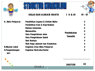 Dokumen tersebut membahas tentang pembelajaran tematik di sekolah dasar, khususnya untuk kelas 1-3. Pembelajaran tematik dilaksanakan dengan menggabungkan beberapa mata pelajaran melalui tema sebagai pusat perhatian, dengan harapan siswa dapat belajar secara lebih menyenangkan dan bermakna. Dokumen ini juga menjelaskan tentang penentuan tema, contoh tema, alokasi waktu, penila