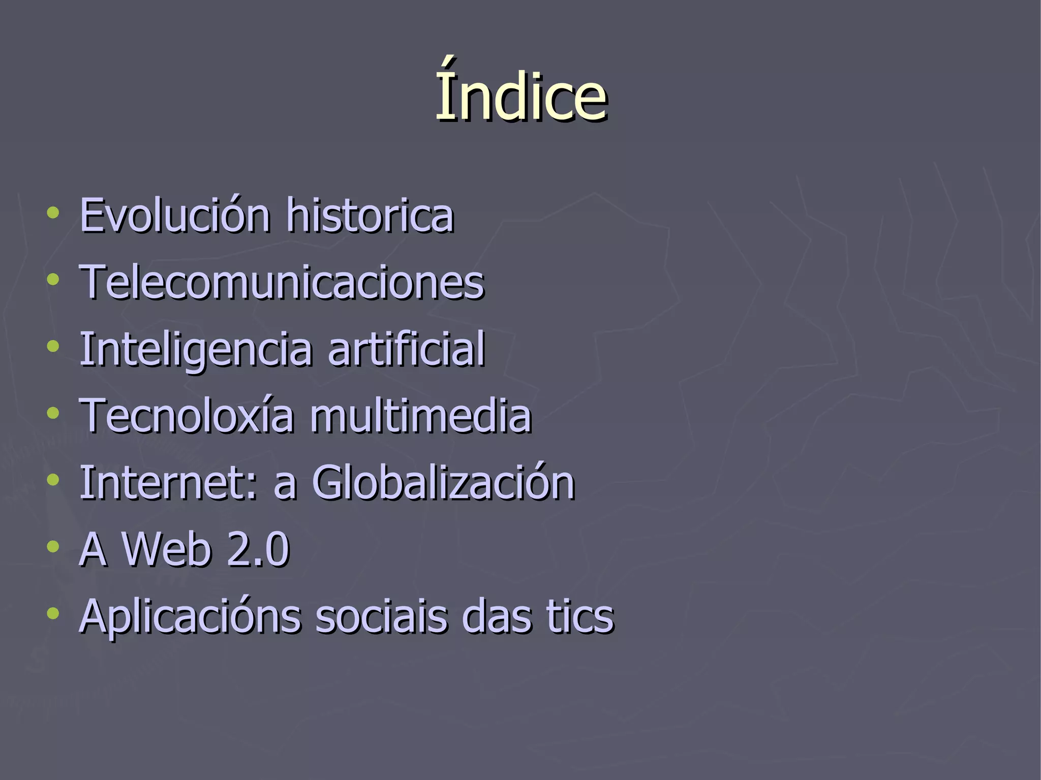 Índice Evolución historica Telecomunicaciones Inteligencia artificial Tecnoloxía multimedia Internet: a Globalización A Web 2.0 Aplicacións sociais das tics