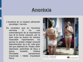 Bulímia És untrastorn de l'alimentació d'origen nerviós.Les persones bulímiques mengen fins que ja no poden més, d'una manera descontrolada i sobretot mengen productes d'un immens valor calòric i després, vomiten. La bulímia en molts casos ve donada pels nervis, o altres factors d'aquest tipus com malestar, discussions amb la família... i tots aquests factors s'acumulen i es perd el control. La bulímia comporta les mateixes malalties que l'anorèxia, però normalment acostumen a ser molt més greus, ja que si es provoca el vòmit de manera regular, pot produir malformacions d'estómac i fetge, tenir hemorràgies, càncer i es pot arribar a la mort.
