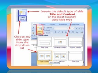 This document provides a step-by-step tutorial on how to use PowerPoint. It covers topics such as slide layouts, adding text, charts and pictures, changing slide backgrounds, using design themes, adding slide transitions and animations. The tutorial demonstrates how to insert music and sound files, and how to animate text. The overall purpose is to teach someone how to create and enhance a PowerPoint presentation.