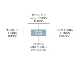 The document lists various living things such as cows, chickens, cats, dogs and humans. It also lists their basic needs of sunlight, water, food, air and shelter. It describes how living things change through birth, growth, reproduction and death. It notes that both animals and plants provide important products for humans, with animals giving food, company, help and other materials while plants give food, wood/paper, clothes, clean air and medicines.