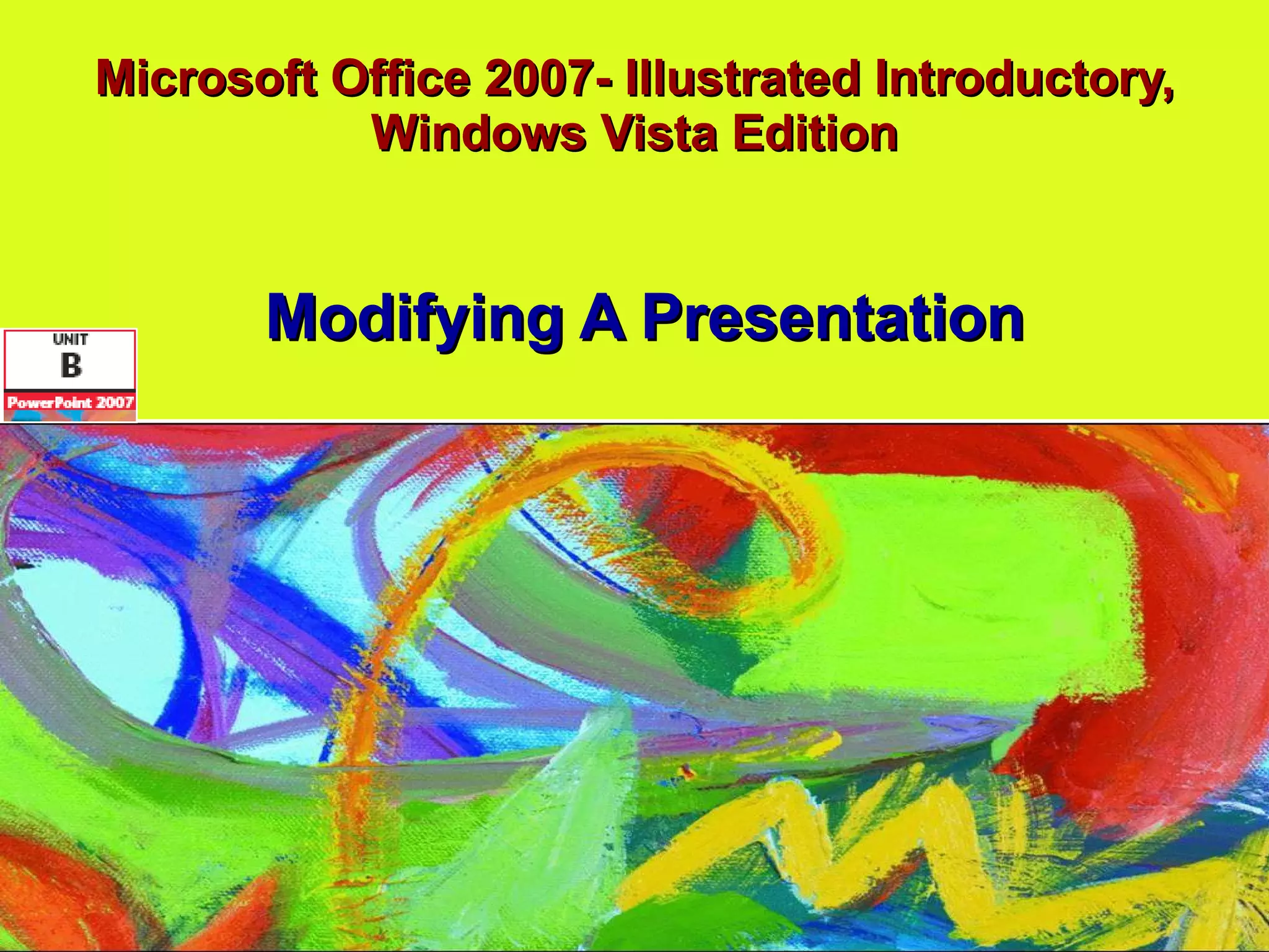 The document discusses various features for modifying presentations in Microsoft PowerPoint. It covers entering and formatting text, converting text to SmartArt graphics, inserting and editing shapes, aligning and grouping objects, adding slide headers and footers, and checking spelling. Some key points covered include using the outline tab to enter text, formatting text using options on the format tab, converting existing text to SmartArt graphics with a single click, modifying shapes using the drawing tools, and precisely positioning objects using alignment and grouping features.