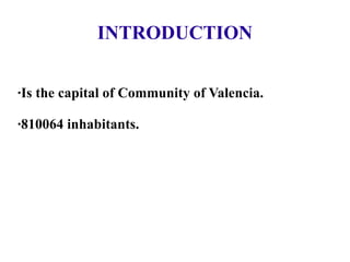 Valencia is the capital of the Community of Valencia in Spain, with a population of over 810,000 people. It has a Mediterranean climate that is warm and wet, with average temperatures around 18 degrees Celsius. Valencia's economy centers around industries like investing and entrepreneurship, and it is known for festivals like Las Fallas, its rice-based cuisine like paella and horchata, and international sporting venues.